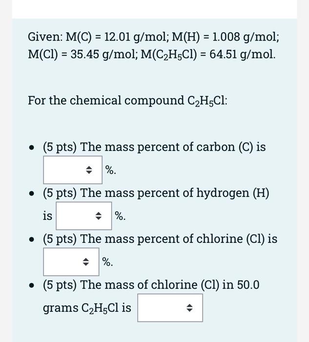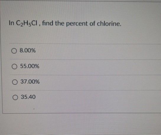 Solved In C2h5cl Find The Percent Of Chlorine O 8 00 0 Chegg Com